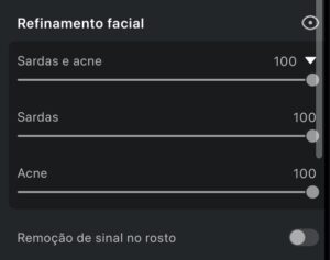 Os sliders individuais de Sardas e Acne só ficam disponíveis após a ativação do recurso principal.