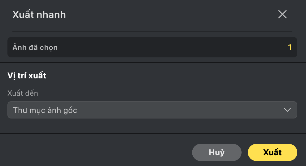 Ảnh đã xuất: Hiển thị tổng số ảnh được chọn để xuất (số thứ nhất) nhân với số lần mỗi ảnh sẽ được xuất (số thứ hai), dựa trên số lượng cài sẵn xuất đã chọn. Nếu không chọn cài sẵn nào, số lần xuất mặc định là 1.