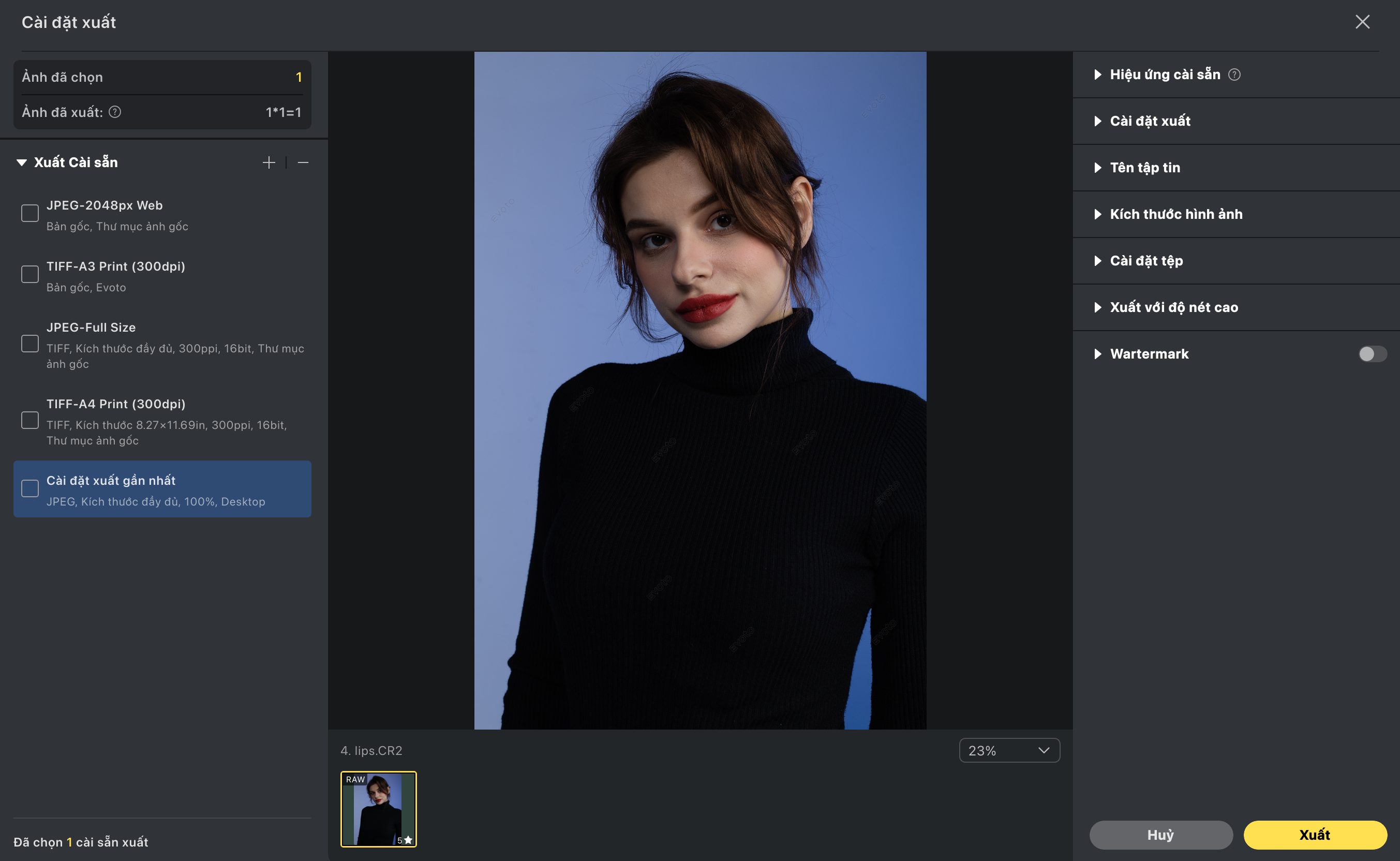 - Bảng bên trái: Hiển thị số lượng ảnh cần xuất và cho phép chọn các cài sẵn xuất.