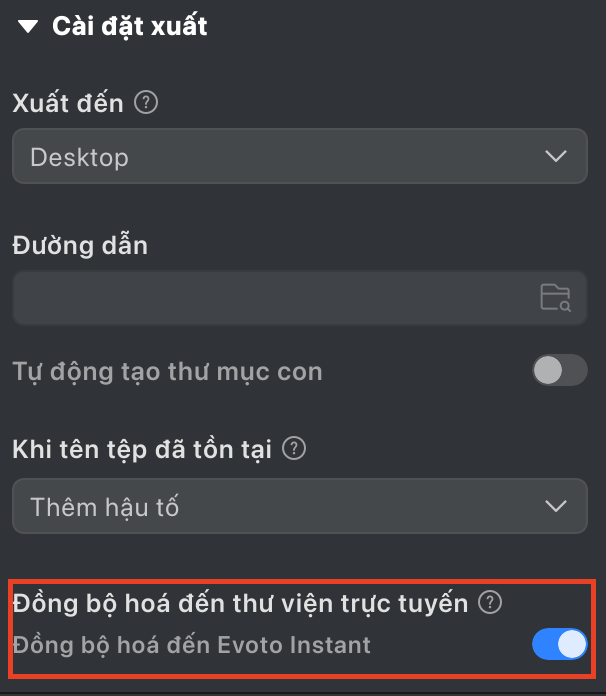 - Đồng bộ hóa đến Evoto Instant: Ảnh đã xuất có thể được đồng bộ lên Evoto Instant để tạo liên kết trực tuyến.