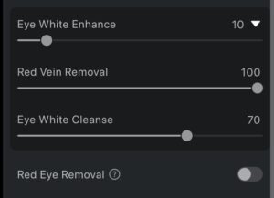 - Eyes (Whites) – Adjusts the brightness of the white part (aka sclera) of the eye (Range: 0–100, Default: 80)