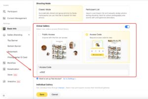 - Access Code: Visitors must enter a unique access code to view the gallery, providing an extra layer of security and controlled access.
