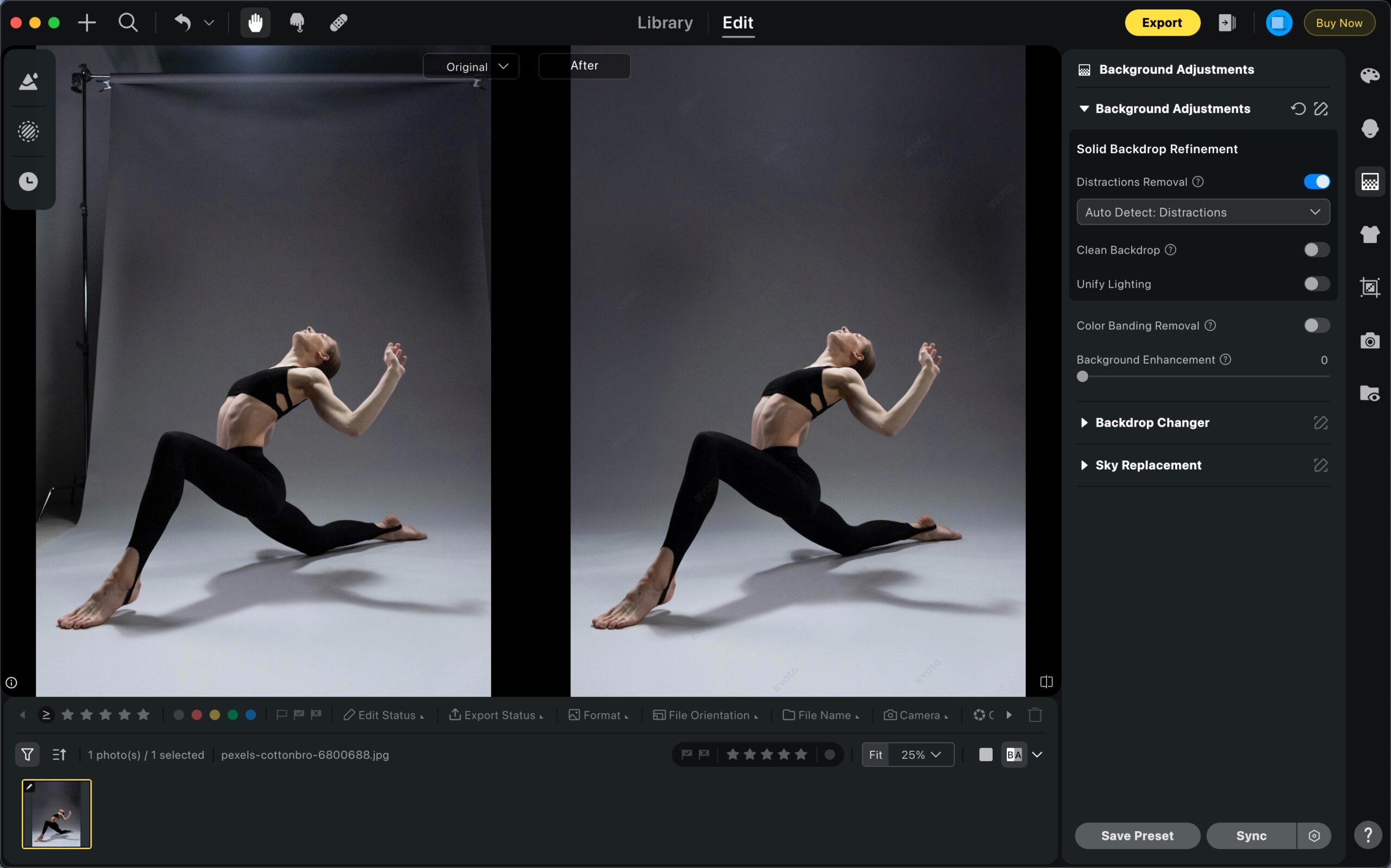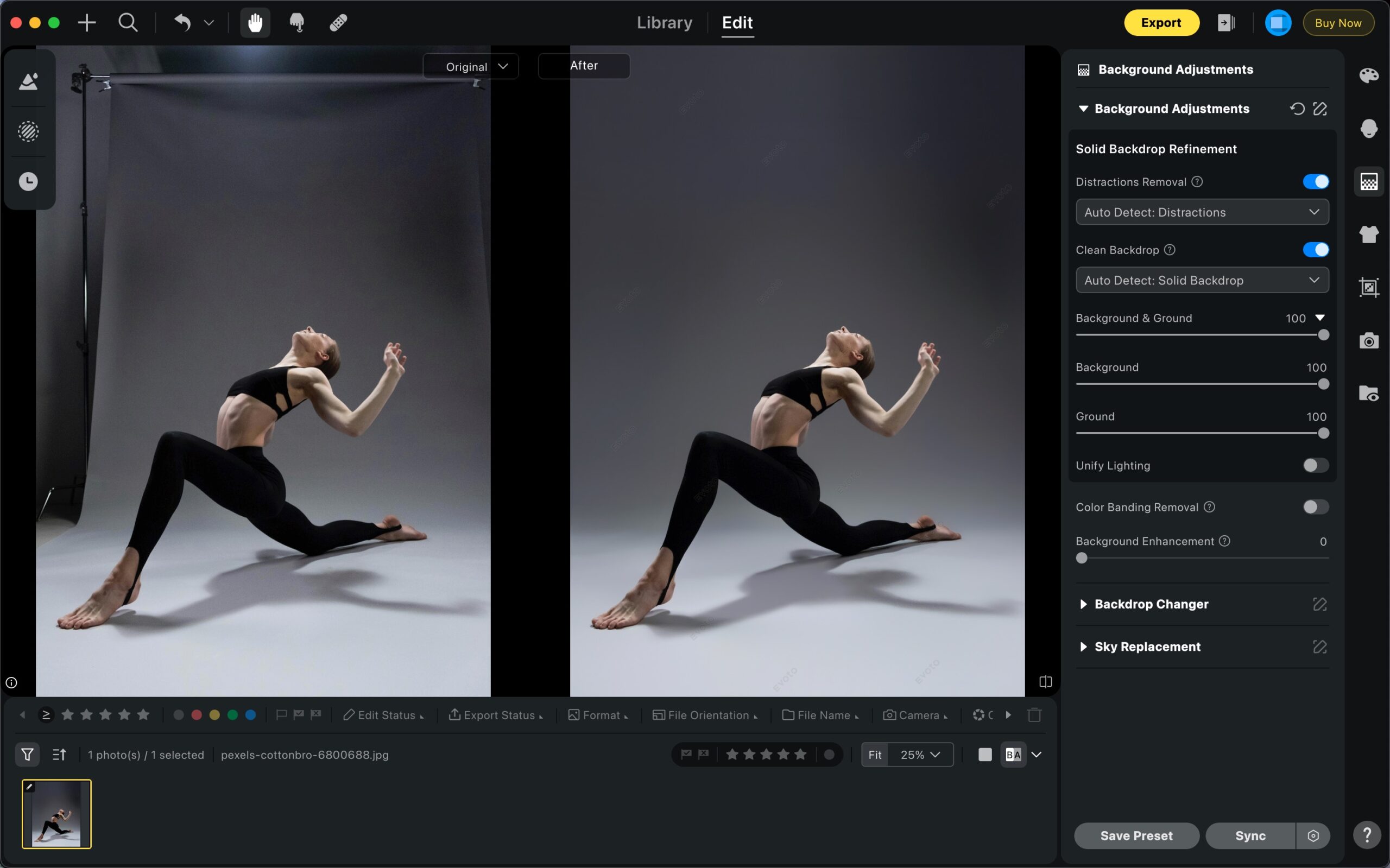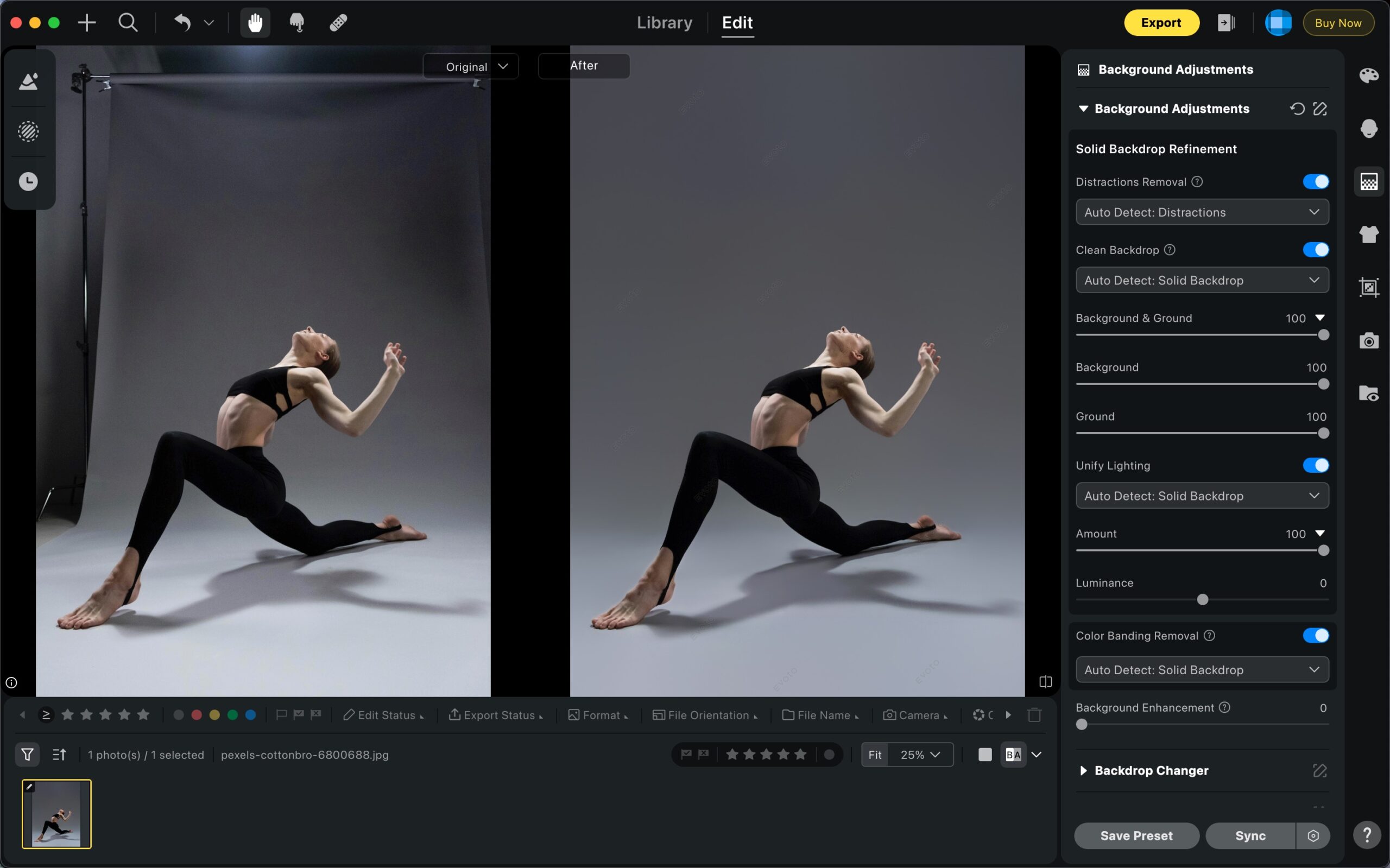 With all four steps combined—distraction removal, clean backdrop, unified lighting, and color banding removal—you’ll achieve a flawless studio background that looks polished and professional. Each tool works with just a simple toggle and a few slider adjustments, so you can clean up your photo in minutes.