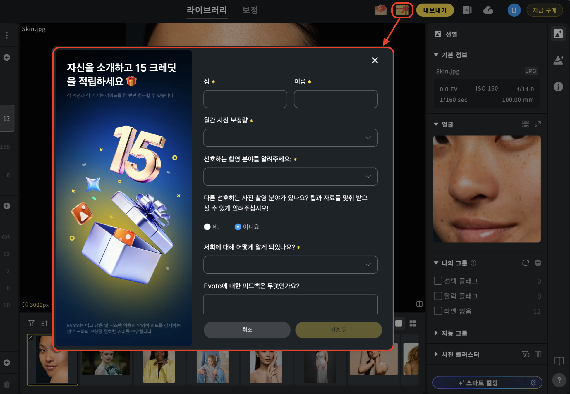 보정된 사진 내보내기: 편집된 사진을 내보낼 때마다 1 크레딧이 차감됩니다.