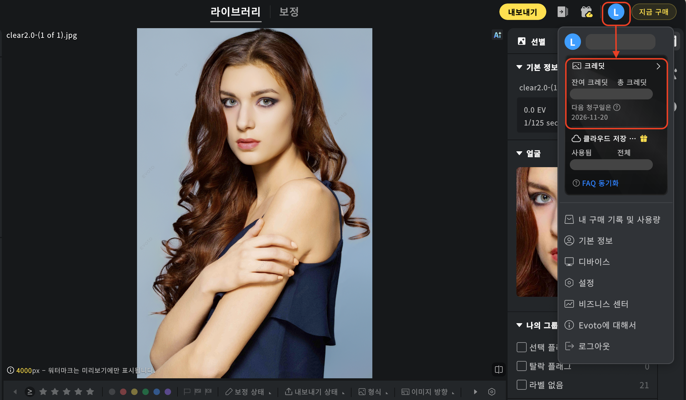 - 1 크레딧 = 1장의 고급 보정 사진 내보내기