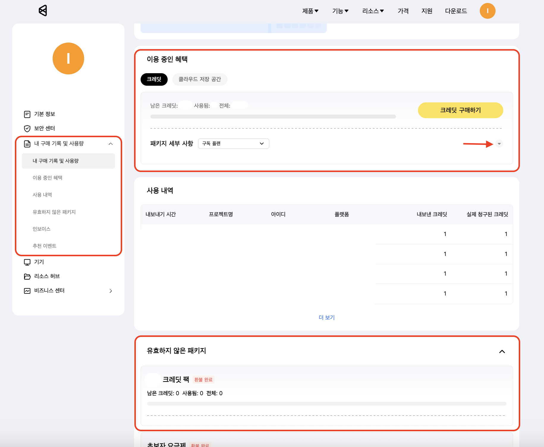 다시 내 구매 기록 및 사용량 클릭하여 크레딧 내역 확인