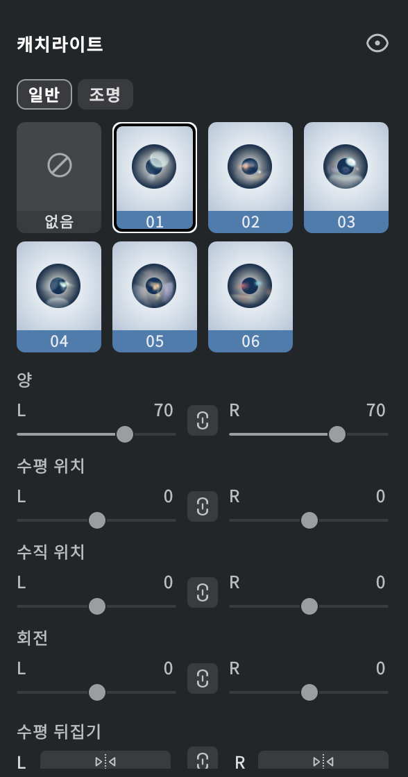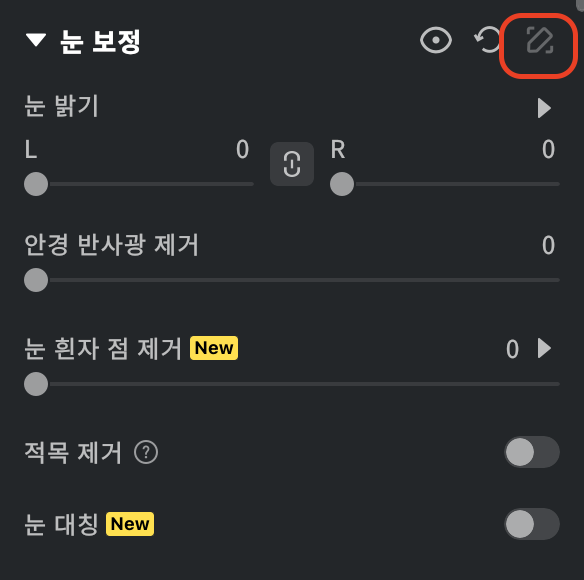 눈 밝기 – 인물 눈의 전체적인 밝기로, 좌측 및 우측 모두에 대한 부가 기능을 함께 조절할 수 있습니다(연결 조절), 또는 각각 별도로 조절할 수도 있습니다(분리 조절).