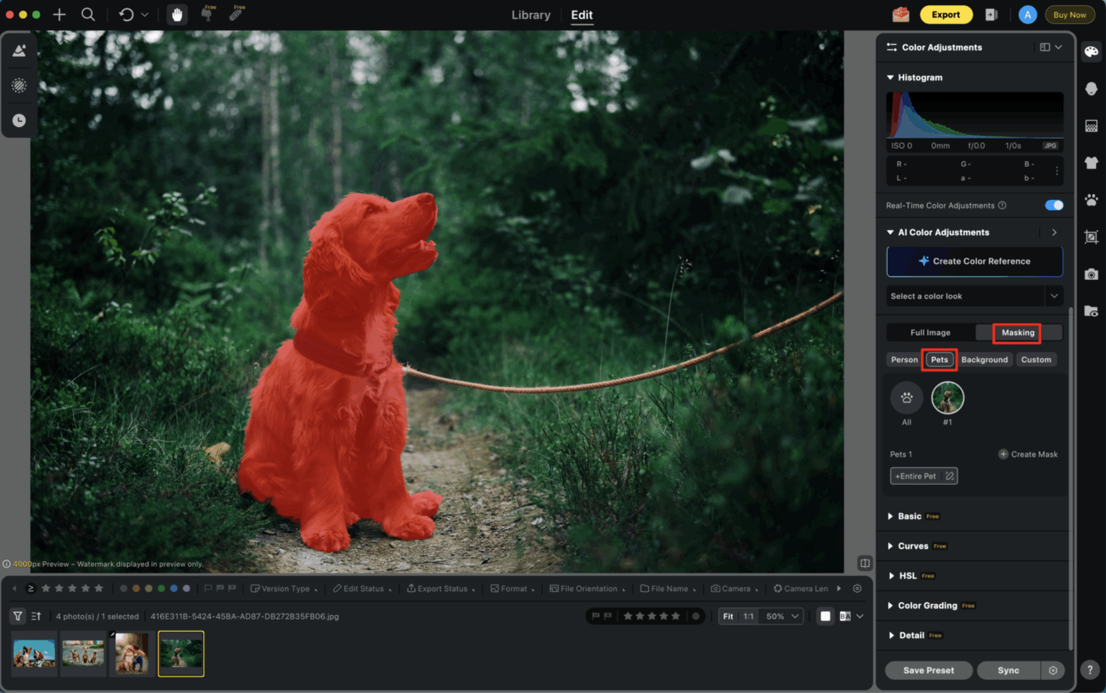 반려동물 마스킹 기능을 활용하면, 인물이나 배경과는 독립적으로 반려동물의 색감을 조정할 수 있어 보다 전문적인 반려동물 사진 연출이 가능합니다. 사진의 모든 요소를 자유롭게 조절할 수 있어 창의적인 컨트롤이 극대화됩니다.