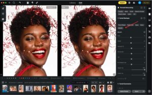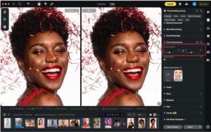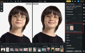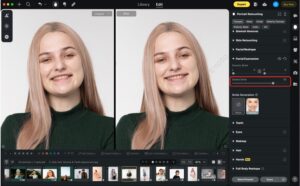 • Geração de Sorriso: Gera automaticamente um sorriso, mesmo que o sujeito não estivesse sorrindo na foto original. Funciona especialmente bem em retratos espontâneos ou headshots profissionais, onde uma expressão acolhedora faz toda a diferença.
