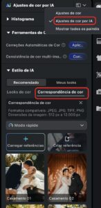 Caminho: Ajustes de cor > Ajustes de cor por IA > Recomendado > Correspondência de cor