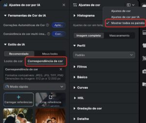 Alterne o panel de “Mostrar todos os painéis”, Correspondência de cor aparecerá nas abas Recomendado e Meus Looks.