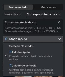 O recurso Correspondência de cor por IA foi aprimorado para oferecer mais flexibilidade e controle. Você pode escolher entre Modo Rápido e Modo de Controle, dependendo da sua necessidade. Use o Modo Rápido para resultados rápidos e o Modo de Controle quando desejar visibilidade completa e ajustes finos.
