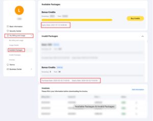 Pacotes Disponíveis: Mostra os pacotes ativos, com os créditos restantes e suas respectivas datas de expiração.