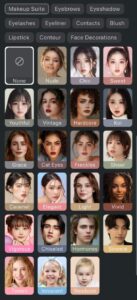 Uma coleção com 18 looks de maquiagem predefinidos, incluindo 2 desenvolvidos para retratos masculinos e 2 para crianças.