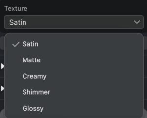 • Batom – 15 cores disponíveis. É possível também ajustar a Textura após selecionar uma cor.