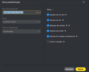 As predefinições são uma forma poderosa de acelerar o seu fluxo de trabalho, aplicando configurações salvas em novas imagens com apenas um clique. Elas agrupam um conjunto de ajustes — como retoque, cor e aprimoramentos com IA — em um formato reutilizável.