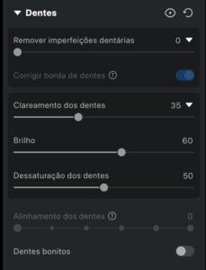 O módulo Dentes foi desenvolvido para realçar a aparência dos dentes em retratos, oferecendo ferramentas para clarear, corrigir e refinar detalhes dentários a fim de obter um sorriso mais limpo e polido. Esses recursos são especialmente úteis para corrigir problemas estéticos comuns, como manchas, desalinhamentos e aparelhos dentários visíveis.
