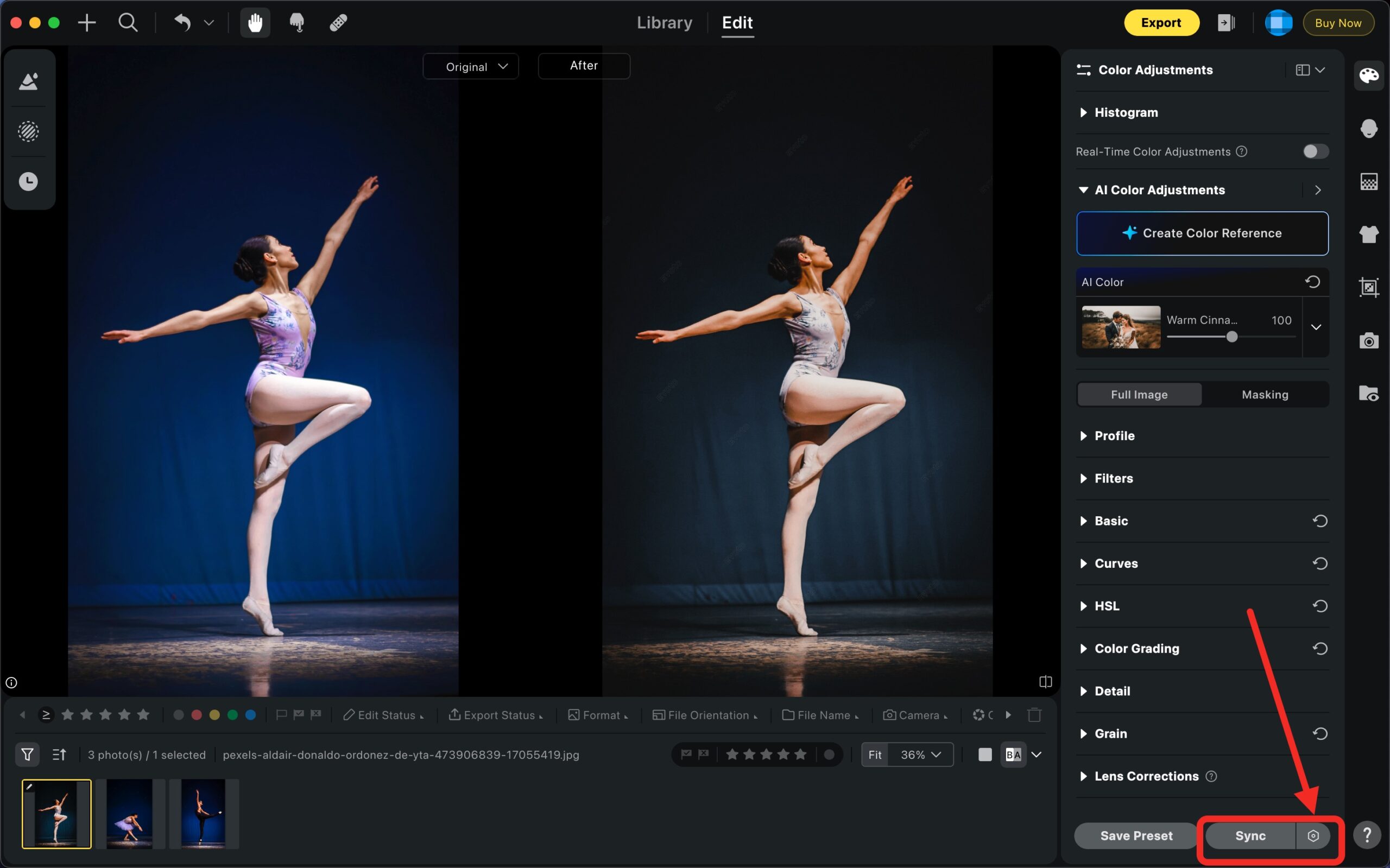 Click the Sync button. Evoto will copy all the effects from the yellow-highlighted photo to all the white-highlighted photos.