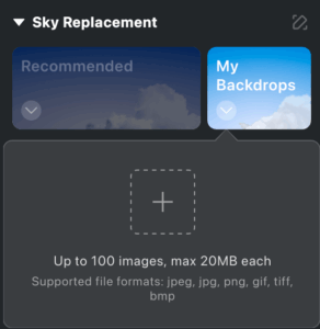 - My Backdrops – Upload your own sky image by clicking the ➕ icon. Supported formats include JPG, JPEG, PNG, GIF, TIFF, and BMP. Maximum file size: 20MB.