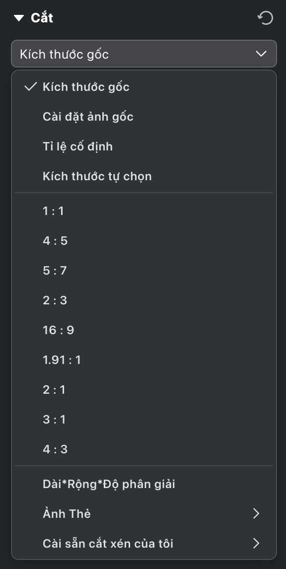 • Các kiểu cắt khác sẽ sử dụng độ phân giải gốc của ảnh.