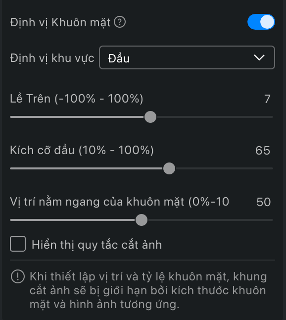 • Khi khung cắt bị dịch chuyển hoặc thay đổi kích thước nằm ngoài phạm vi mà khuôn mặt có thể được tính toán, toàn bộ tính năng định vị khuôn mặt sẽ bị làm mờ và không khả dụng. Khi thả chuột, khung cắt sẽ quay lại vị trí ban đầu.