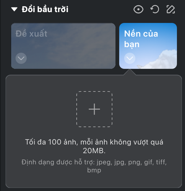 - Bầu trời của bạn: Tải lên ảnh bầu trời của riêng bạn bằng cách nhấn vào biểu tượng ➕. Các định dạng hỗ trợ gồm JPG, JPEG, PNG, GIF, TIFF và BMP. Kích thước tệp tối đa: 20MB.