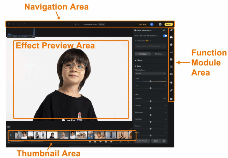 • Giữa – Khu vực xem trước hiệu ứng: Bạn có thể xem trước các bức ảnh đang chỉnh sửa tại đây. Ảnh xuất ra sẽ hiển thị hiệu ứng chỉnh sửa sau cùng.